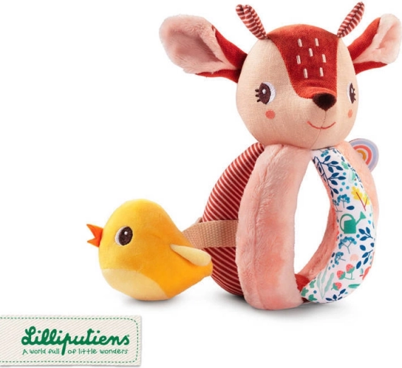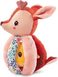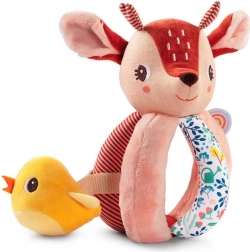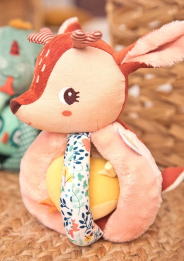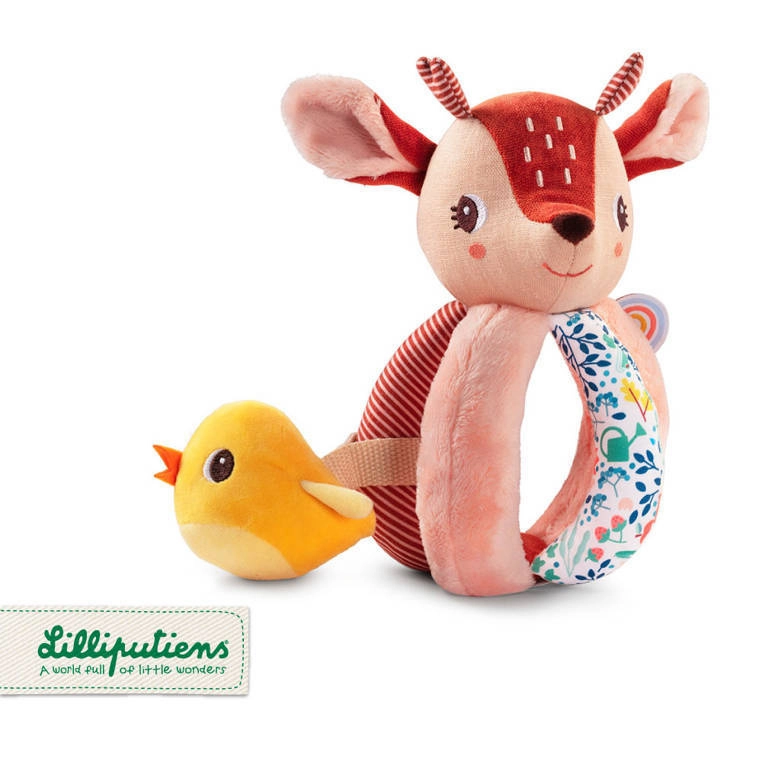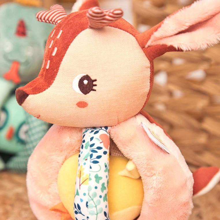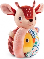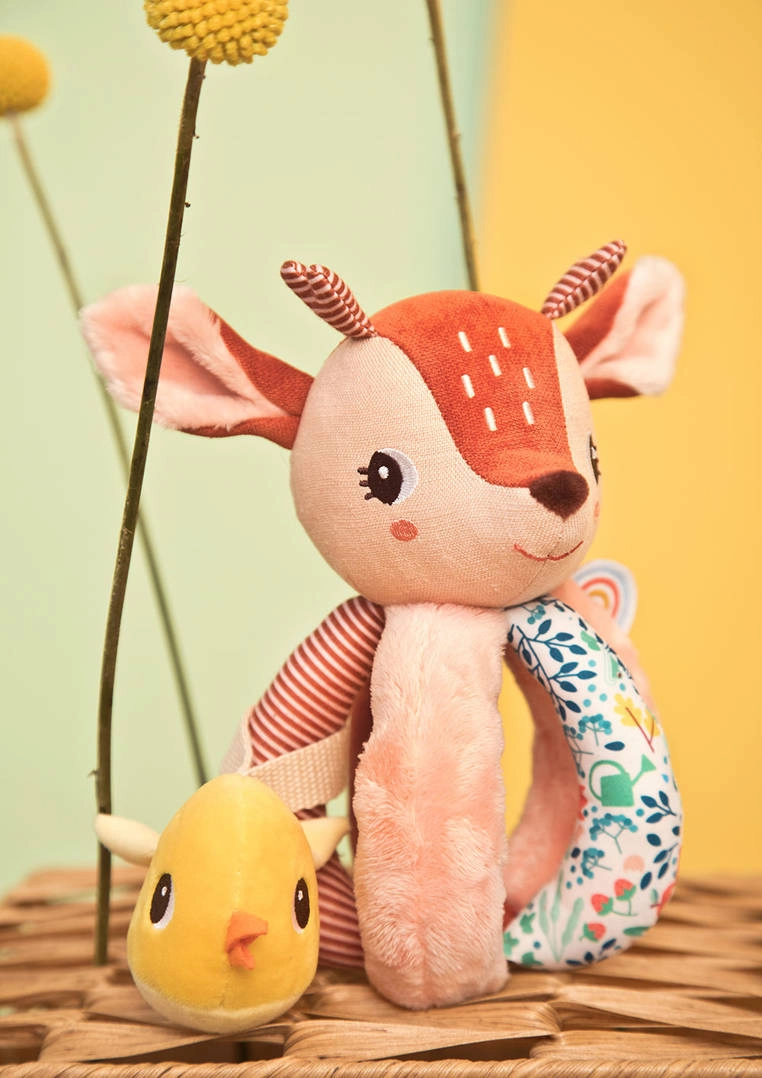 Srnica Stella je mehka tekstilna prijateljica, ki dojenčka zabava z oprijemanjem, tresenjem, vstavljanjem in izvlekanjem. Telo sestavlja mehka krogla s petimi prijemi – eden z repkom, drugi s šelestečim učinkom in z teksturirano »mavrico« za bogate tipne občutke. V glavici je skrit nežen zvonček, rumeni ptiček na trakcu prijetno ropoče in ga je mogoče potiskati noter in ven.