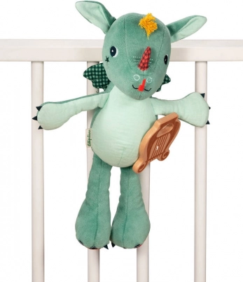 Plišasti zmaj je izdelan iz nežnih in varnih materialov, ki so prijazni do otroške kože. Jersey in organski bombaž zagotavljata varnost in udobje.