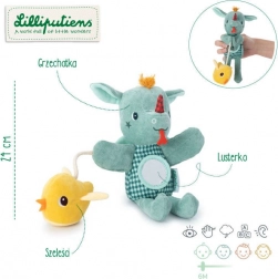 Aktivna lutka za roko malega zmaja v zeleni barvi z rdečim rogom in jezičkom je odlična za pripovedovanje pravljic, branje in umirjanje pred spanjem. Zahvaljujoč odprtinam v tačkah jo zlahka oživite in vključite otroka v igro. Vgrajeni elementi – ropotuljica v glavici, ogledalce na trebuščku in šušteča piščančka – prinašajo senzorične dražljaje in zabavo.