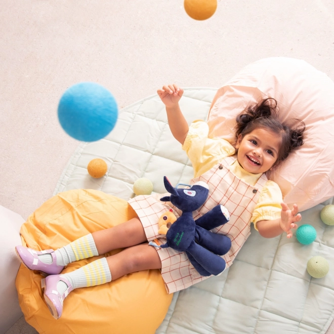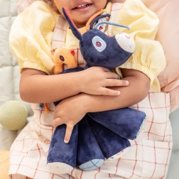 Igrača je izdelana iz kakovostnega poliestra in bombaža, ima prijetne teksture za taktilno stimulacijo in je ustvarjena za crkljanje doma in na poti. Čiščenje je preprosto – dovolj je brisanje površine z vlažno krpo.
