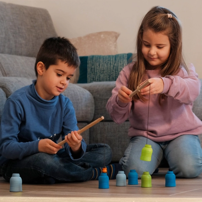 Zabavna in varna lesena ribiška igra za 2 igralca od 4. leta naprej, ki razvija fino motoriko, koordinacijo oko–roka ter otroke vodi k ekološkemu razmišljanju. Brez magnetov, z nastavljivo dolžino vrvice za preprosto spremembo težavnosti. Cilj je “uloviti” lesene steklenice in tako simbolno rešiti morje pred plastiko.