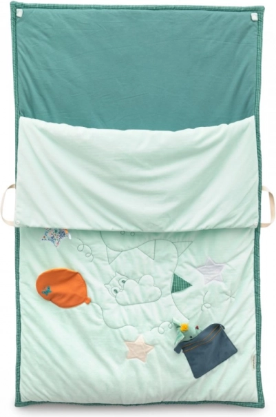Ta večnamenska odeja Lilliputiens je idealen spremljevalec za dojenčke od prvih dni. Kot igralna podloga podpira senzorični razvoj – ponuja varno okolje za raziskovanje tekstur, poslušanje šuštenja, odkrivanje lastnega odseva v ogledalcu in igro z ropotuljico zmajčka.