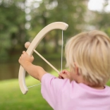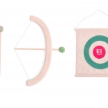 Vsebina paketa vključuje lesen lok z merami 40 × 13 cm, tri puščice dolžine 26,5 cm in tekstilno tarčo velikosti 26 × 29,5 cm. Izdelek je zasnovan tako, da je varen, hkrati pa nudi pristno izkušnjo lokostrelstva. Opozorilo: Ni primerno za otroke, mlajše od 36 mesecev, zaradi majhnih delov, ki jih lahko vdihnejo ali pogoltnejo. Uporabljajte le puščice, ki so del paketa, in upoštevajte varnostna navodila.