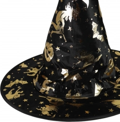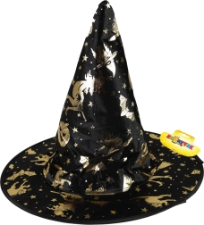 Dodajte otroškemu kostumu pravo čarobno piko na i. Lahek in udoben klobuk v črni barvi je posut z zlatimi dekoracijami, ki se na svetlobi efektno bleščijo. Odlično pristoji in se zlahka kombinira s plaščem in masko.