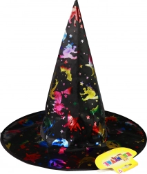 Klobuk krasijo barvni holografski motivi, ki mu dodajo čaroben videz.
