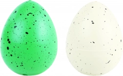 Vsako jajce ima unikaten zeleni dizajn s črnimi pikami in skriva raznobarvnega dinozavra.
