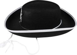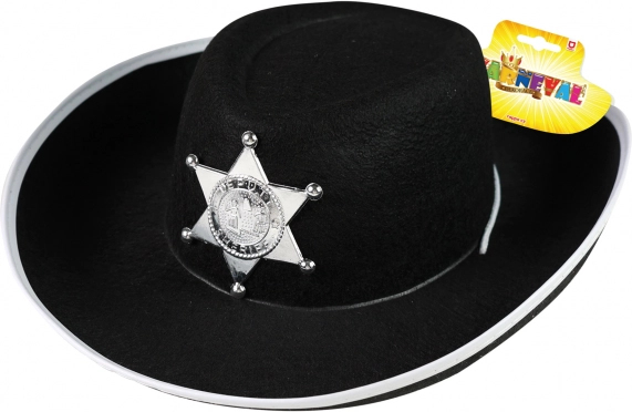 Dodajte kostumu malega kavboja avtentičen videz. Ta otroški kavbojski klobuk v elegantni črni barvi krasita izrazita šerifova zvezda in belo obrobljanje po obodu, ki ustvarja stilski kontrast. Vrvica pod brado zagotovi, da klobuk dobro stoji tudi med razigrano igro.