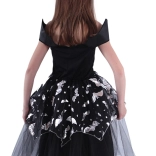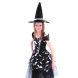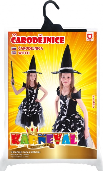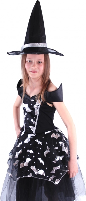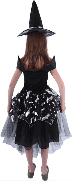 Ta čarobni čarovniški kostum je idealna izbira za vsako malo damo, ki se želi preobraziti v stilno čarovnico! Kostum vključuje črno obleko z motivi netopirjev, srebrnimi elementi in napihnjenim krilom, ki obleki doda pravo mero elegance in skrivnostnosti.
