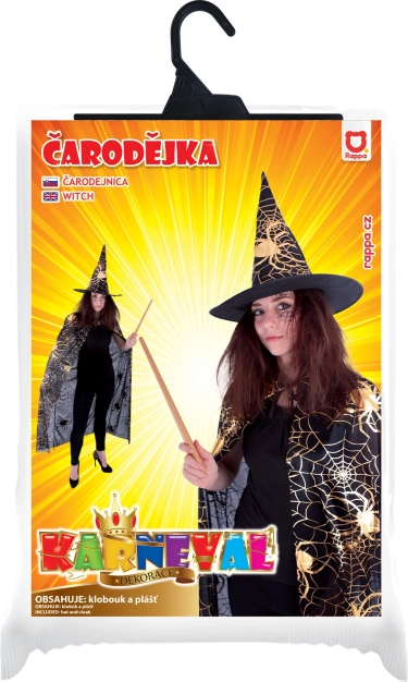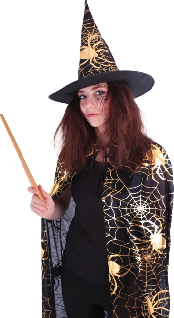 Vstopite v svet čarovnije s tem elegantnim čarovniškim kompletom za odrasle – črn plašč z zlatimi motivi pajčevin ter ujemajoči špičasti klobuk ustvarita mističen, izrazit in fotogeničen kostum za noč čarovnic, karneval in tematske zabave. Lahkoten material zagotavlja udobno nošenje ves večer. Palčka ni vključena v paket.