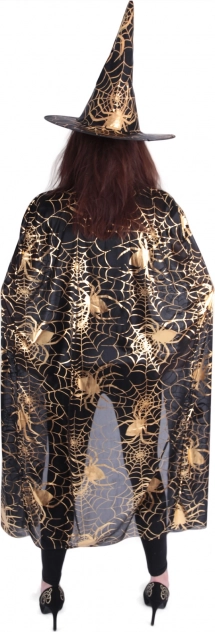 Stajliš čarovniški plašč in klobuk z bleščečim zlatim potiskom pajčevin spremenita vsak kostumski večer v magičen dogodek. Zaradi univerzalnega kroja in lahkega materiala sta udobna za nošenje in ju je mogoče preprosto kombinirati z drugimi dodatki. Idealna izbira za noč čarovnic, pustni ples, cosplay in tematsko fotografiranje.