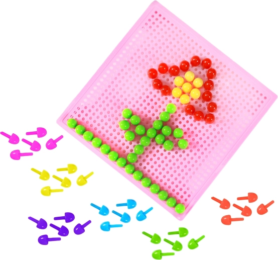Mozaika je idealna za doma in vrtce – trdna vstavljiva podlaga drži gobice na mestu, različne barve pa spodbujajo učenje barv in oblik skozi igro. Odlična ideja za darilo za predšolske otroke.