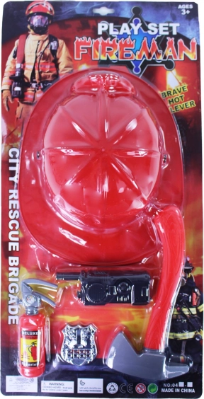 Na reševalno akcijo! Ta otroški gasilski komplet vsebuje čelado, sekiro, gasilni aparat, radijsko postajo in značko – vse potrebno za male junake. Vsi dodatki so izdelani iz trpežnega PVC.