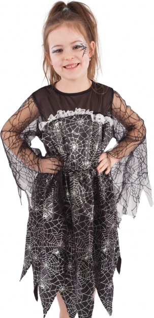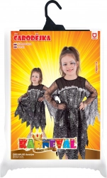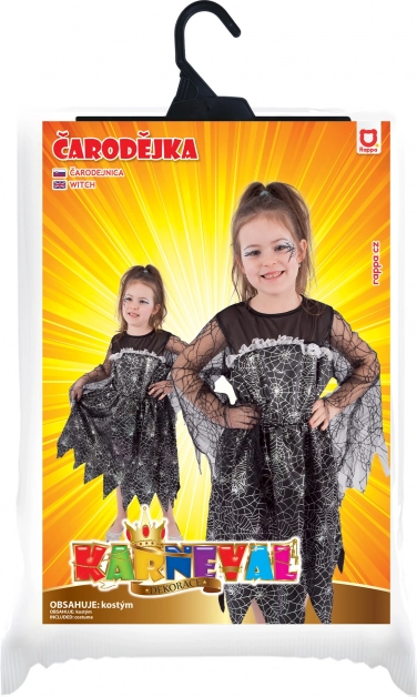 Kontrastna srebrna pajčevina na črni obleki, cik-cak obrob in mrežasti rokavi dajejo kostumu pristno čarovniško vzdušje, ki izstopa na vsakem dogodku.