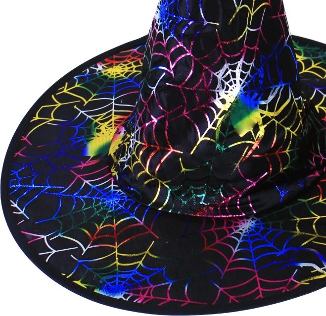 Dodajte svojemu kostumu za noč čarovnic ali karneval edinstven pridih z elegantnim črnim čarovniškim klobukom, okrašenim z barvnimi pajčevinami. Lahek in prožen material je udoben za nošenje, medtem ko širok rob in stožčasta konica ustvarjata ikonično silhueto.