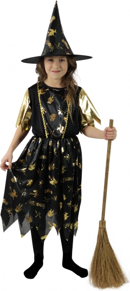 Ta očarljiv otroški kostum čarovnice v črno‑zlatni kombinaciji je idealen za noč čarovnic, karneval in tematske zabave. Obleka z nežno bleščečimi zlatimi vzorci in cik‑cak robom ustvari pravo čarobno vzdušje, dopolnjuje pa jo popolnoma usklajen špičast klobuk.