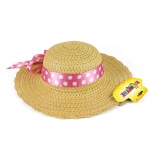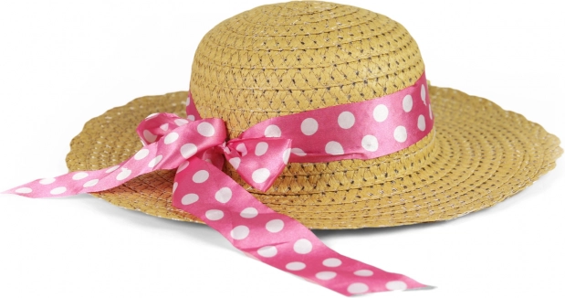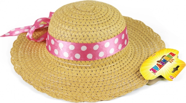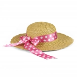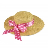Lep otroški slamnat klobuk, idealen za male dame, okrašen z rožnatim trakom z belimi pikami.