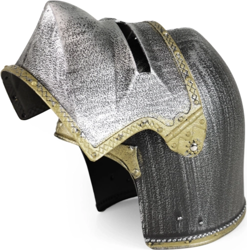 Srebrno siva izvedba z zlatimi poudarki daje čeladi zgodovinski videz, idealen za pustne zabave in domače viteške dogodivščine.