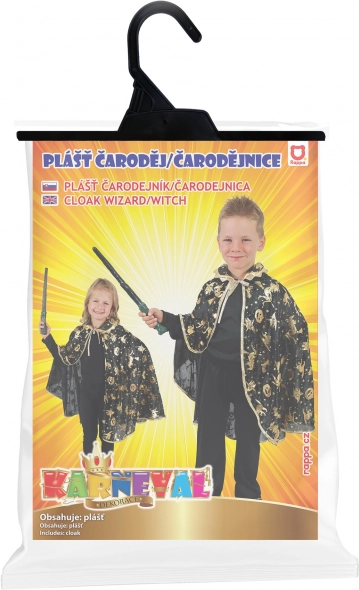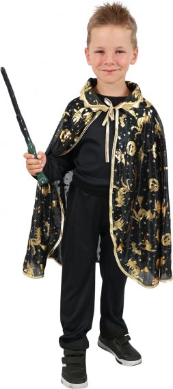 Črn otroški čarovniški plašč z zlatim potiskom zvezd, lun in drugih motivov v trenutku spremeni vsakega otroka v malega čarovnika. Je lahek, prijeten za nošenje in se zaradi zavezovanja pri vratu zlahka obleče.