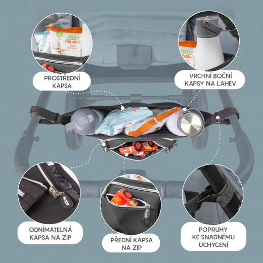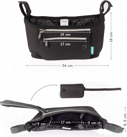 Neoprenski organizator je idealen za starše, ki potrebujejo, da so vse potrebne stvari skupaj in zaščitene pred vplivi okolja. Izdelan iz kakovostnega neoprenskega materiala, ponuja: