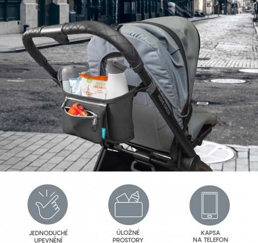 Univerzalni neoprenski organizator za voziček, ki ščiti vaše stvari in omogoča enostavno pritrditev na večino vozičkov s pomočjo ježkov.