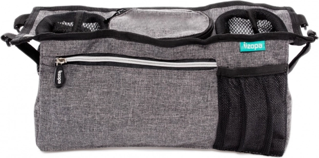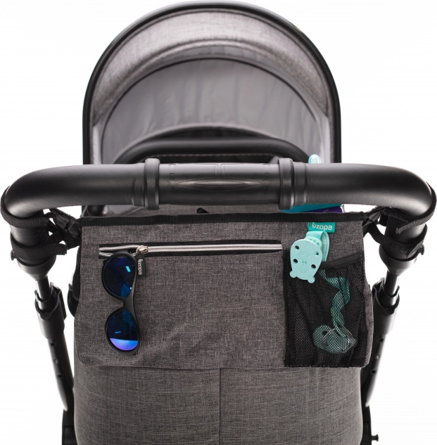 Praktičen in pregleden organizator za voziček je idealen za sprehode z dojenčkom. Sprednji del organizatorja vsebuje velik žep na zadrgo za drobnarije, ki jih mamica lahko potrebuje med sprehodom. Sprednja stran je prav tako opremljena z mrežastim žepkom za mobilni telefon, tako da ima mamica vedno pregled, ko se s telefonom kaj dogaja, kljub tihemu načinu. Dojenčka tako nič ne bo zbudilo. V srednjem delu se nahaja velik žep na zadrgo za shranjevanje potrebnih stvari. Na stranskih delih ima dva držala za pijačo.