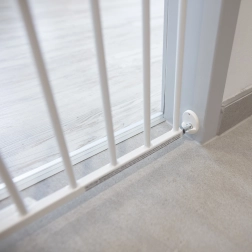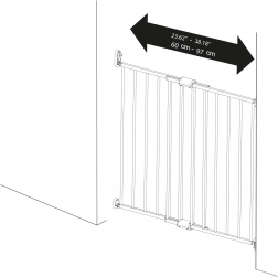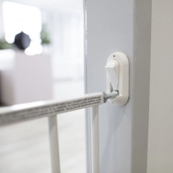Varnostna ograja Simply je idealna rešitev za zavarovanje prehodov, hodnikov ter zgornjega ali spodnjega dela stopnišča. Trdno se montira v steno z vložki in vijaki, z razteznih mehanizmom na sredini pa jo preprosto prilagodite širini vašega odprtine od 60 do 97 cm. Odpiranje z eno roko olajša vsakodnevno uporabo staršem in skrbnikom.