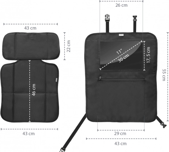 Dvodelna zasnova omogoča prilagodljivo uporabo glede na starost otroka in vrsto vožnje. Spodnji del ščiti sedež pred vtisi in umazanijo od otroškega sedeža, medtem ko zgornji del preprečuje umazanijo na naslonu zaradi čevljev in s prozornim žepom zagotovi varno namestitev tablice.