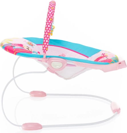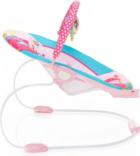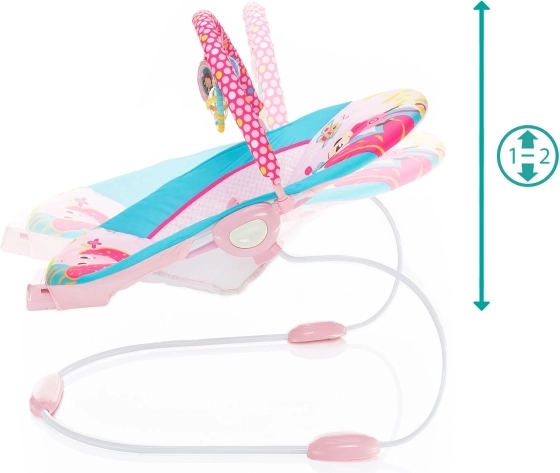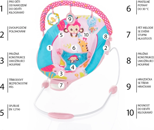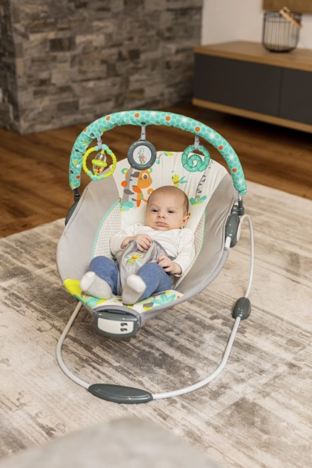 Varnost in udobje zagotavljata 3-točkovni varnostni pas in nedrseče nogice. Otroci lahko v celoti izkoriščajo nihajni mehanizem ležalnika ter uživajo v igralnem loku s tremi igračami, ki razvijajo njihove čute in fino motoriko.