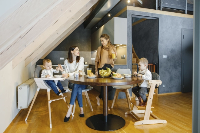 Eleganten belo-siv dizajn se poda vsakemu interierju. Omogoča uporabo pri skupni mizi zahvaljujoč možnosti odstranitve pladnjev.