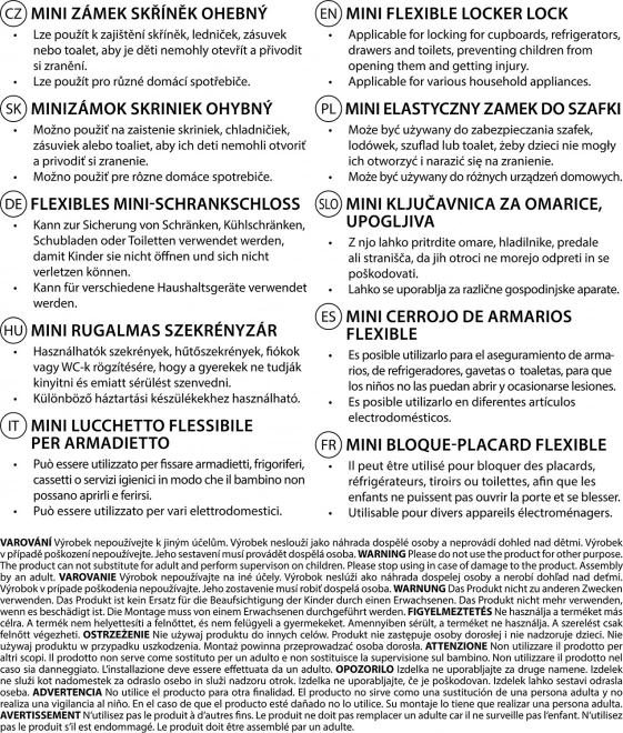 • Upogljiv mini zaklep je namenjen za zavarovanje omaric, predalov ali stranišč, da jih otroci ne bi mogli odpreti in se pri tem poškodovati