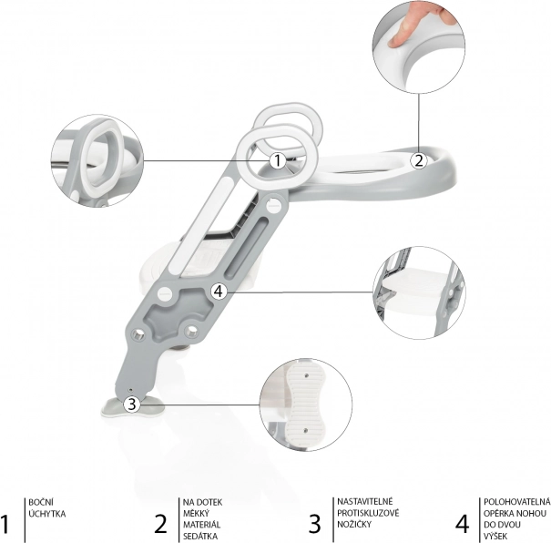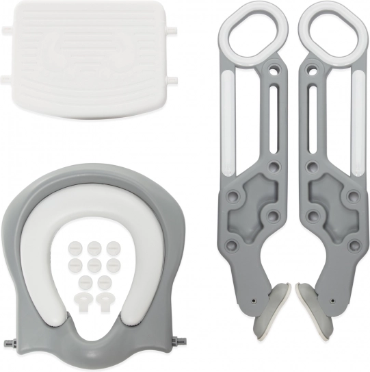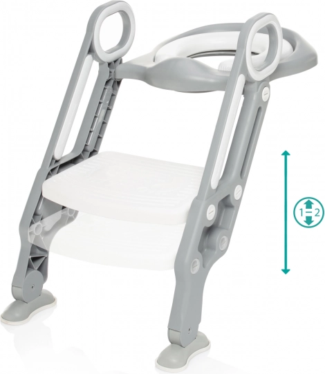 Stopnice bodo zaradi nastavljive višine rasle z vašim otrokom vse do trenutka, ko jih ne bo več potreboval. Trdna konstrukcija zagotavlja, da se bo otrok pri plezanju in sedenju počutil varno. Noge so opremljene s posebno protizdrsno plastjo, ki nudi občutek stabilnosti in opore. Del stopnic je tudi mehak in udoben sedež, ki služi kot redukcija za klasično stranišče. Anatomska oblika sedeža skupaj z dvignjenim zadnjim delom odlično preprečuje neželeno umazanijo.