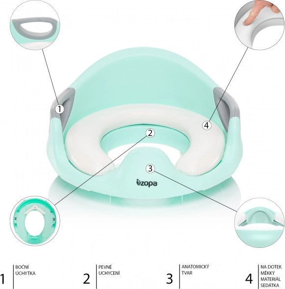 Prehod z kahlice na klasično stranišče je za vsakega otroka velika sprememba. Z lahkoto pa jo bo premagal s praktičnim pomočnikom – WC sedežem ZOPA Coach. Sedež je izdelan iz trpežne, nestrupene plastike brez BPA, ki je bila testirana za varnost. Za čim večje udobje je na trdno konstrukcijo sedeža pritrjen mehak vodoodporen vložek, ki je odporen proti razpokam in deformacijam. Oporo pri sedenju zagotavljajo pametno nameščeni ročaji.