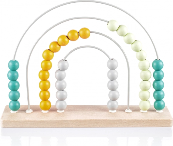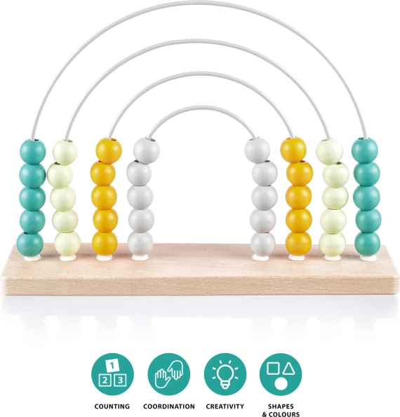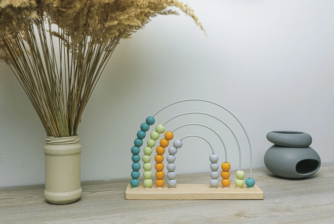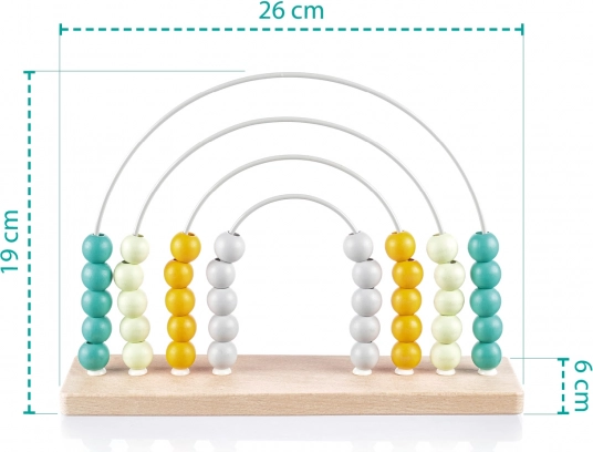 Ta stilski lesen abakus z mavričnim dizajnom je idealen pripomoček za predšolske otroke. Zahvaljujoč pisanim kroglicam na trdnih kovinskih lokih si otroci na igriv način urijo računanje, razvrščanje in prepoznavanje barv. Naravni bukov les in barve na vodni osnovi zagotavljajo varno in vzdržljivo izvedbo.