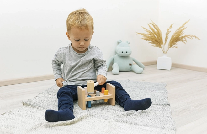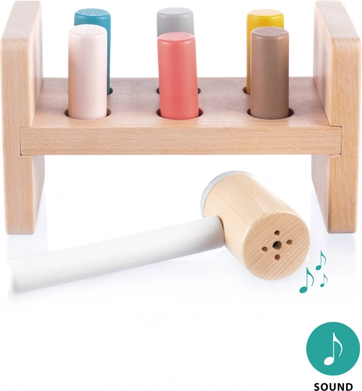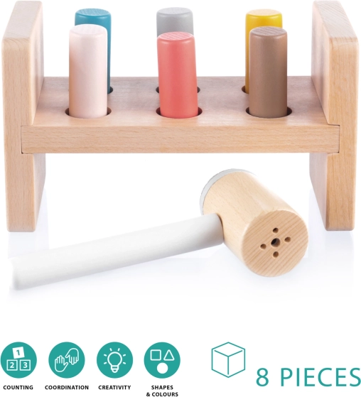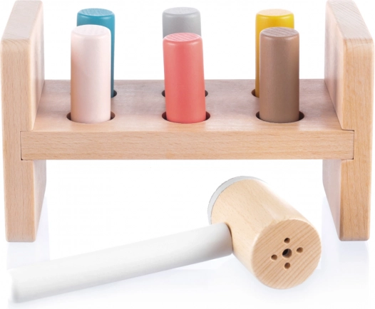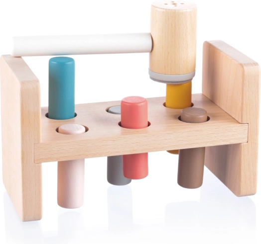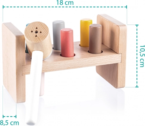 Pod stojalom je praktična odprtina za shranjevanje kladiva, ko otrok igrače ne uporablja. Ta igrača pomaga razvijati motorične sposobnosti, uči otroke prepoznavanja barv in izboljšuje koordinacijo. Izdelana je iz naravnega bukovega lesa in varnih barv na vodni osnovi, kar zagotavlja njeno kakovost in varnost.