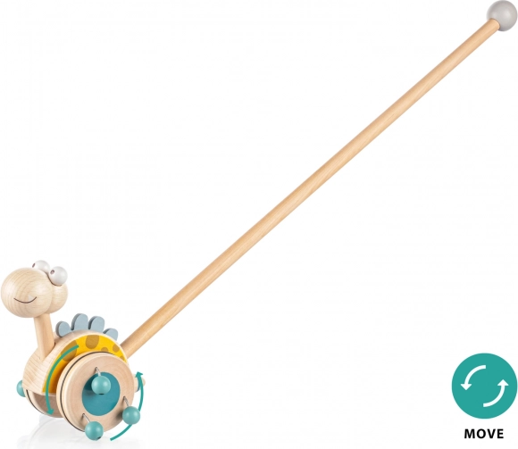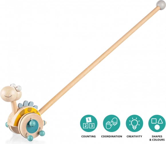 Jezdec na dolgi palici je popolna igrača za otroke, ki začenjajo hoditi. Dinozaver na palici se med gibanjem vrti in zaradi lesenih kroglic na kolesih oddaja zvok, ki pritegne otroka in ga spodbudi k hoji.