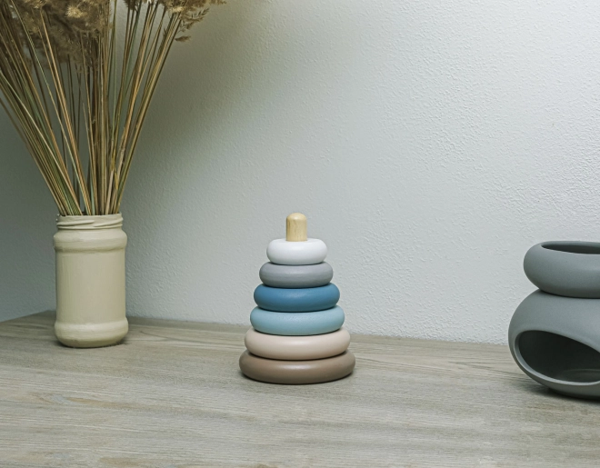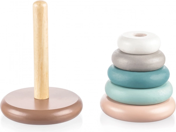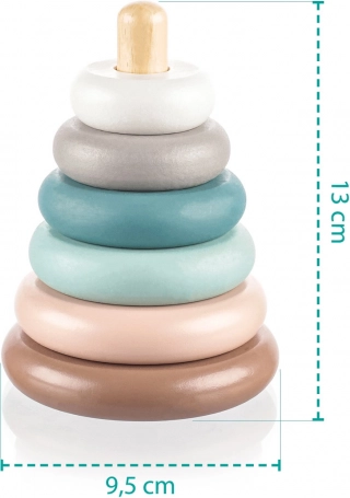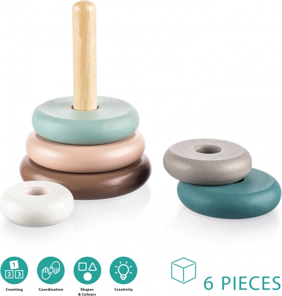 Leseni natikalni obročki prinašajo neskončne možnosti zabave za male raziskovalce. S tem kompletom, ki vsebuje 6 različno velikih kosov, je možno zlagati in preoblikovati številne različne kombinacije. Igrača podpira spretnosti, kot so razvrščanje, zlaganje ter prepoznavanje barv in velikosti.