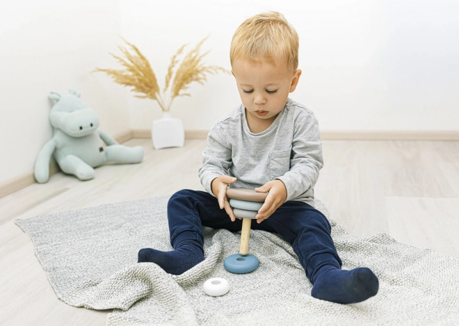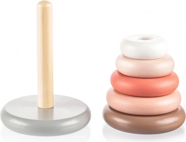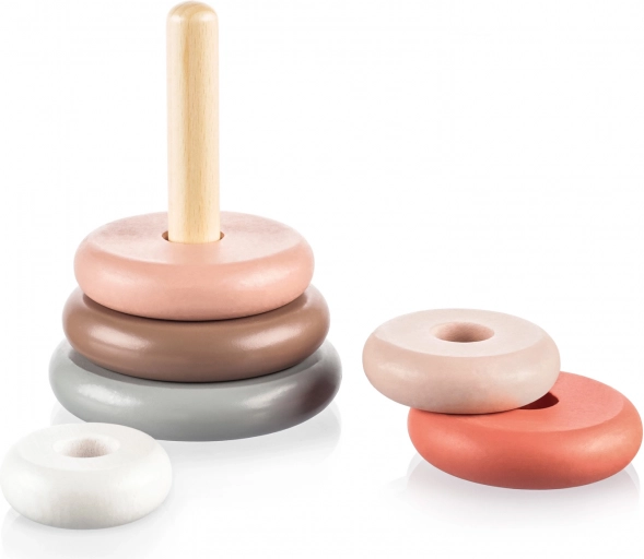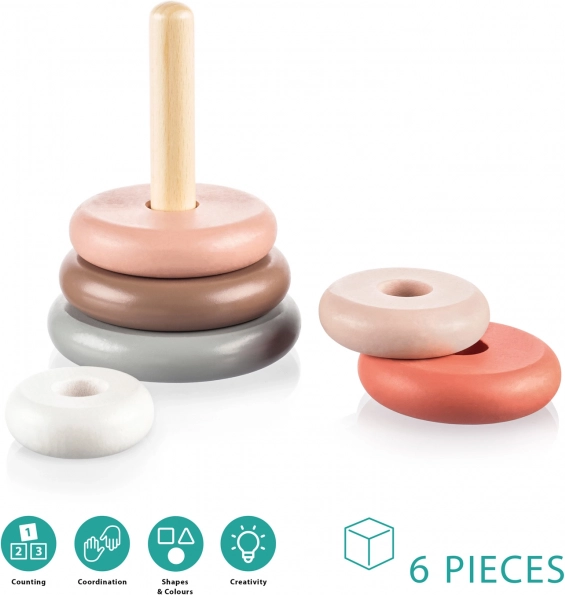 Zlaganje, razstavljanje, razvrščanje in desetine različnih kombinacij – to so leseni zložljivi obroči za radovedne raziskovalce. Set je sestavljen iz 6 kosov različnih velikosti, ki jih je mogoče poljubno zlagati enega na drugega.
