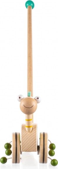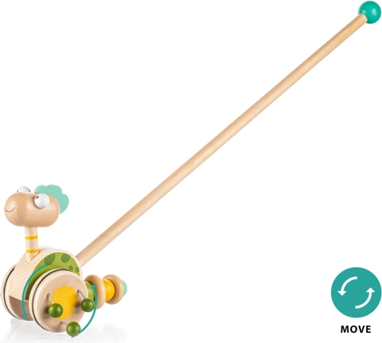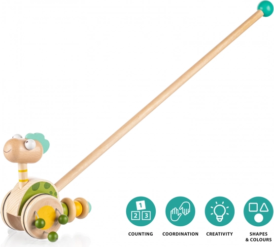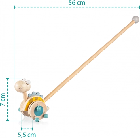 Potiskalo na palici je idealna igrača za otroke, ki začenjajo hoditi. Zabavni dinozaver na dolgi palici se med premikanjem vrti in zaradi lesenih kroglic, pritrjenih na kolescih, oddaja zvok, ki otroka privabi k hoji in ga zabava za dolge ure.