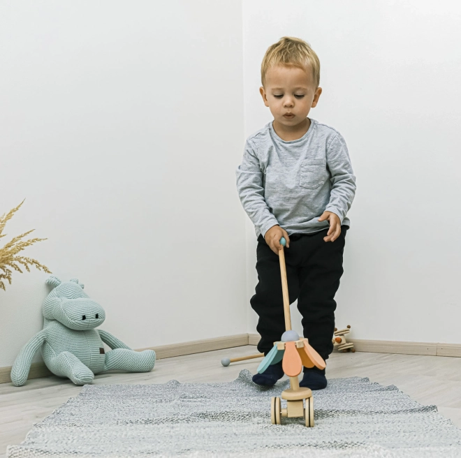 Trdna palica dodatno služi kot opora pri prvih otrokovih korakih, na koncu pa je opremljena z leseno kroglo za večjo varnost. Potiskalo nima ostrih robov in je izdelano iz odpornega lesa z dolgo življenjsko dobo.