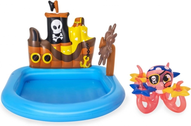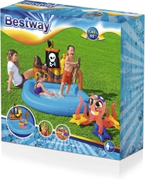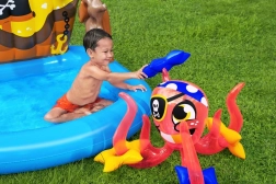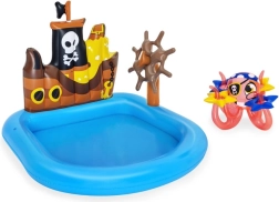 Spremenite vrt v pravo malo vodno kraljestvo. To napihljivo piratsko igrišče BESTWAY ponuja moder bazenček z ladijsko dekoracijo, z vrtljivim krmilom, metanjem obročev/zvezdic in veselo hobotnico. Izdelano je iz odpornega PVC, enostavno za postavitev in idealno za varno vodno zabavo najmlajših.