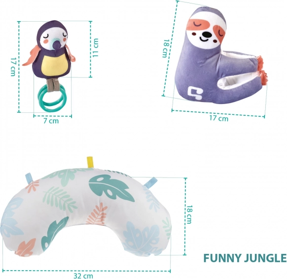Igralna podloga Funny Jungle ustvarja varno in spodbudno okolje za vsakodnevno igro in počitek. Viseče igrače motivirajo dojenčka k stezanju, prijemanju in guganju, s čimer naravno krepi mišice in koordinacijo. Ena izmed igrač predvaja prijetno melodijo, ki pomaga dojenčka pomiriti in pritegniti.
