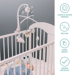 Glasbeni vrtiljak Slonček je idealen za otroško sobico kot lepa dekoracija in pripomoček za uspavanje. Vsebuje plišaste igrače v nežnih barvah in več sladkih melodij, ki podpirajo poslušne, motorične in vizualne zaznave otroka. V posteljici se ustvari prijetno vzdušje in otrok se pomiri za lažje uspavanje.