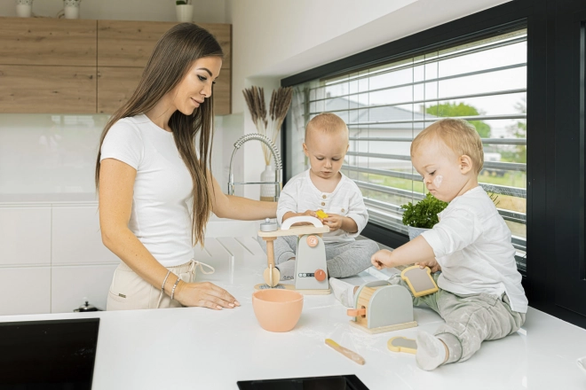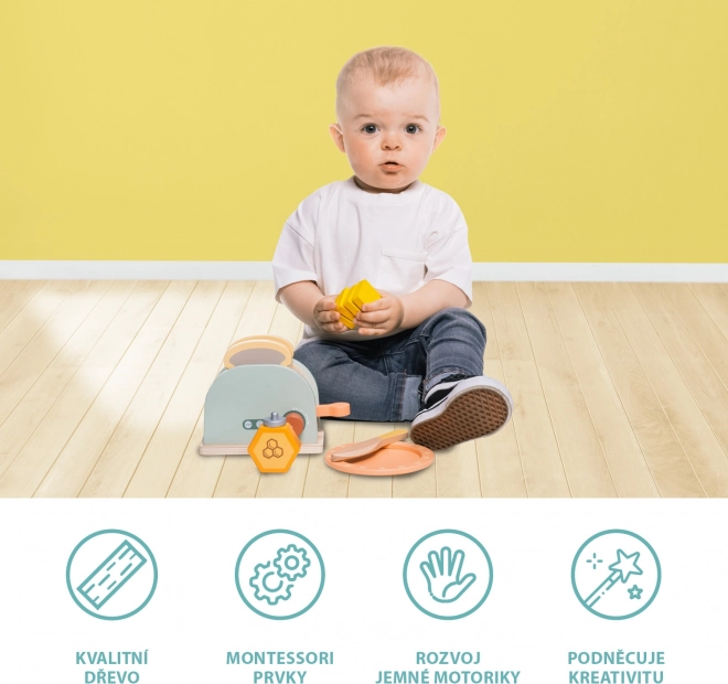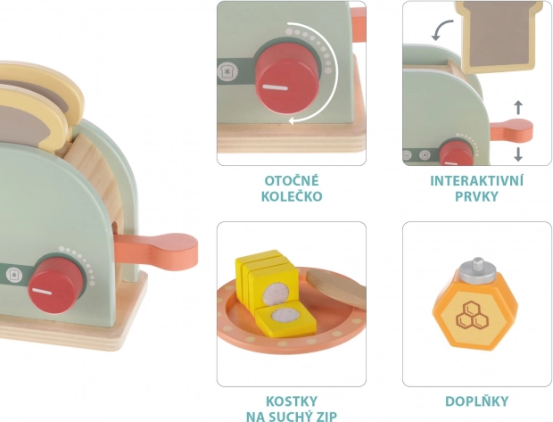 Priprava hrane je zabavna – tudi tiste lesene. Set vsebuje toaster s toastom. Po pritisku na ročico toast skoči iz toasterja. Del kompleta sta tudi krožniček z nožkom in maslom, da je zajtrk popoln. Igrača razvija koordinacijo, prostorsko domišljijo in spretnost rok. Toaster je izdelan iz kakovostnega lesa in barv na vodni osnovi.