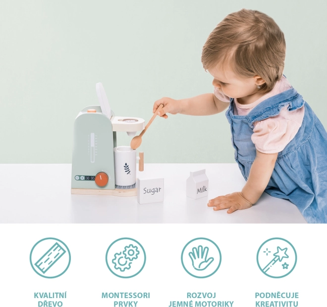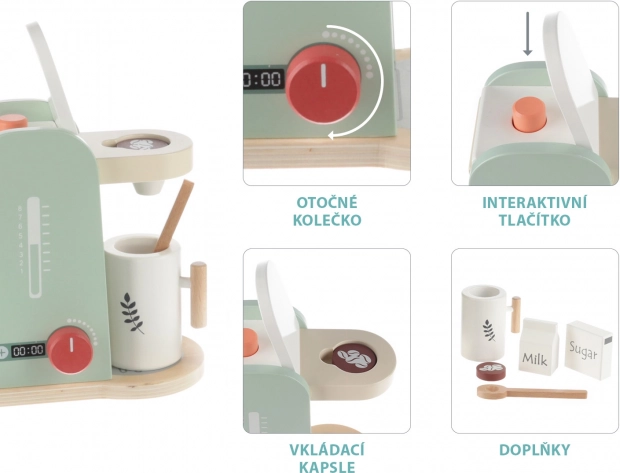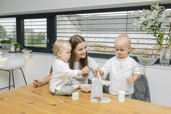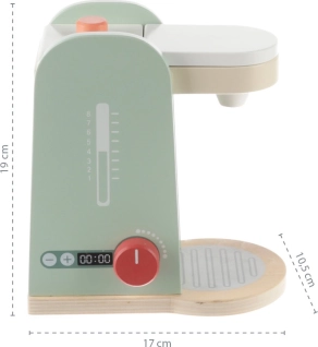 Dodelan leseni kavni avtomat kar vabi k pripravi dobre kave. Kavni aparat ima več gumbov, ki jih je mogoče vrteti ali pritisniti. Del kompleta je velik lesen skodelica z žličko in sestavine za pripravo kave. Igrača je izdelana iz kakovostnega lesa in barv na vodni osnovi.