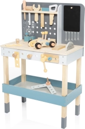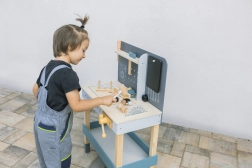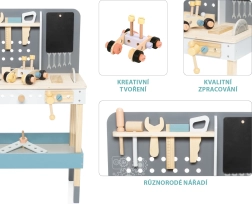 Privoščite svojim otrokom veselje ob ustvarjanju s tem prostranim delovnim pultom, ki ne sme manjkati v nobeni otroški delavnici. Velika delovna površina pulta vsebuje vrsto komponent od lesenih plošč, vijakov do matic. Pod delovno površino bodo otroci našli prostor za shranjevanje vseh svojih orodij.