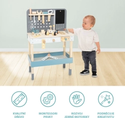 Dodatno je del paketa tudi polica z luknjami, kjer lahko obesite leseno kladivo, merilni trak in žago. Vse je izdelano iz kakovostnega lesa in barv na vodni osnovi, ki so varne za otroke. Ta igrača ne le zabava, ampak tudi razvija motorične sposobnosti, koordinacijo in prostorsko predstavo.