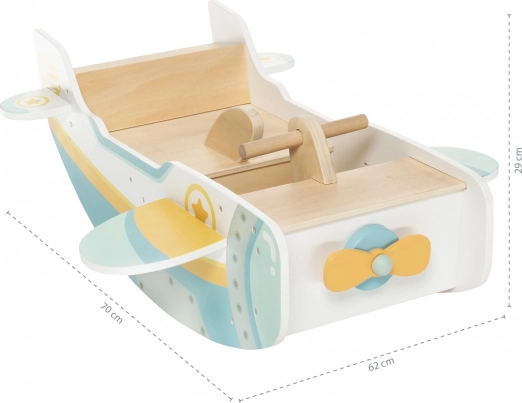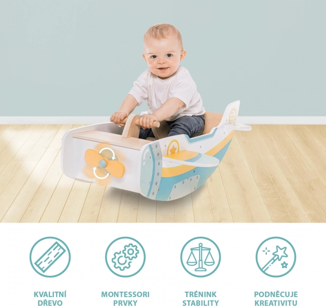 Letalo, pripravljeno na vzlet, ki bo otrokom prineslo ure zabave. Varno guganje je zagotovljeno z dvema ročajema v sprednjem delu. Širok sedež ima naslonjalo za hrbet, če se želi otrok le nežno gugati z lastno težo. Gugalnica v obliki letala je izdelana iz kakovostnega in trpežnega bukovega lesa. Vse uporabljene barve so zdravstveno neoporečne in na vodni osnovi.