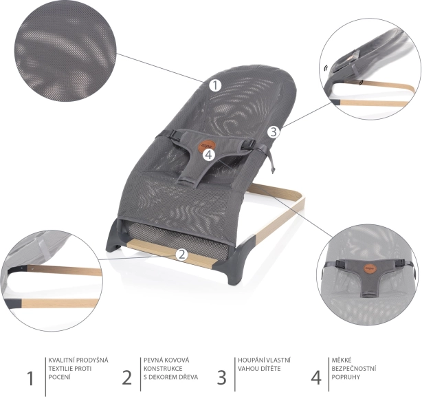 Ležalnik Miura Air omogoča, da je otrok v središču dogajanja, medtem ko se starši lahko posvetijo obveznostim ali zabavi. Mehki trakovi zagotavljajo največjo varnost otroka v ležalniku, medtem ko počiva ali se igra. Mehka zračna tkanina s prezračevalnim sistemom preprečuje potenje dojenčka in nudi udobje tudi v toplejših mesecih.
