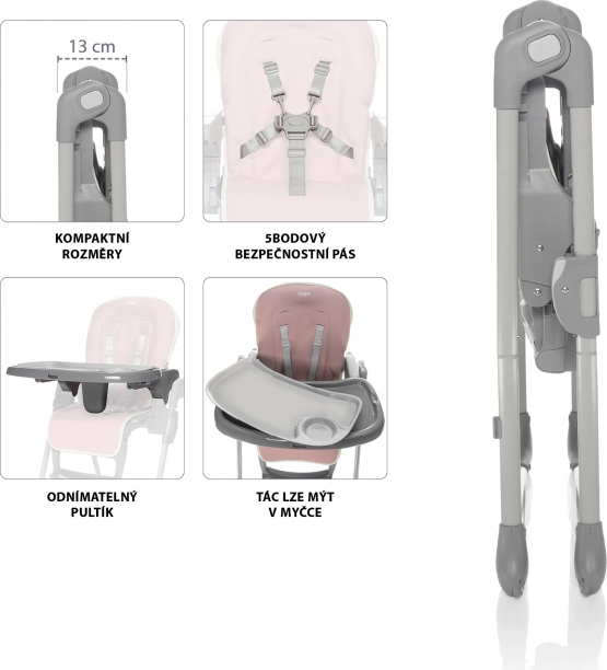Stolček, ki se v celoti prilagodi potrebam staršev in otrok. Trdna, stabilna konstrukcija je zelo lahka in jo je mogoče preprosto zložiti s pomočjo dveh stranskih varoval. V zloženem stanju samostojno stoji na mestu. Zaradi kompaktnih mer je zložen stolček mogoče postaviti tudi v majhne prostore. Po zlaganju je širok le 13 cm.