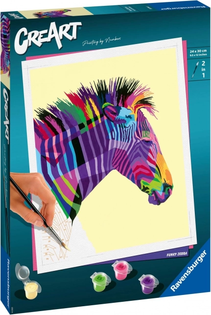 CreArt slikanje po številkah – Funky Zebra. Ustvarjalni komplet za otroke od 12 let. Končana slika 240 × 300 mm, kakovostni materiali, sprostitev in zabava v enem.